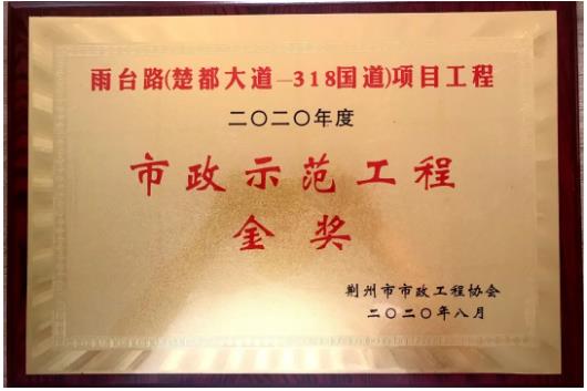 近日,由走进脱裤吧 路桥分公司承建的雨台路(楚都大道-318国道)项目、福阳路(鸡公山路-滨河路)项目,分别获评“2020年度荆州市市政示范工程金奖”。