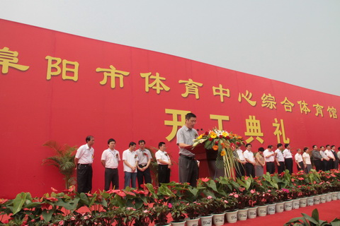 股份有限公司充满了信心与期待,紧接着由阜阳市常务副市长李平同志对阜阳市体育中心综合体育馆工程建设的重要性作了介绍,并要求各部门齐心协力,为综合体育馆工程的建设提供良好的施工环境,最后由主席台领导共同为阜阳市体育中心综合体育馆项目培土奠基,奠基仪式圆满结束。